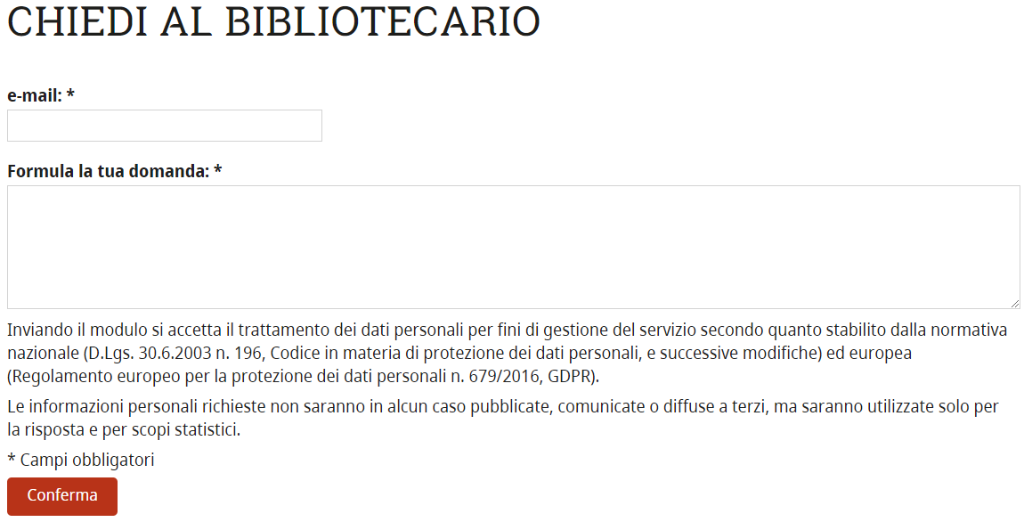 Se non hai trovato il documento desiderato seleziona “Chiedi al bibliotecario” nel menu in alto alla pagina, si aprirà un form da compilare con la tua richiesta.