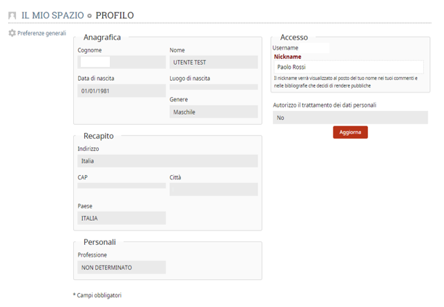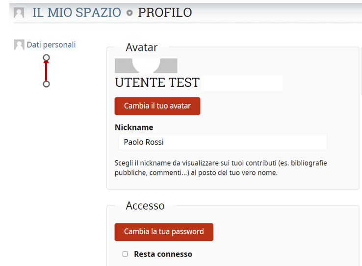 Questa sezione è utile per inserire e modificare i tuoi dati personali nonché cambiare la password. È sufficiente accedere alla sezione Utente dal menu dello spazio personale e cliccare su “Dati personali”.
