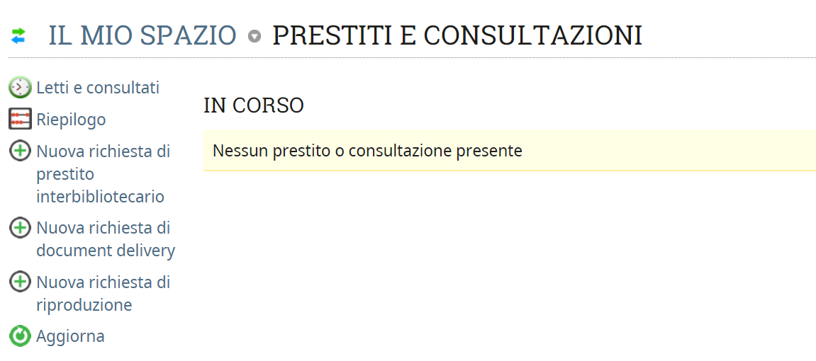 Se non ricordi i tuoi prestiti in corso, questo spazio sarà un promemoria utilissimo! Qui puoi infatti trovare le risorse lette, i prestiti e le consultazioni pendenti. Puoi effettuare nuove richieste di prestito, di document delivery e di riproduzione, ed eventualmente anche cancellare le richieste con un semplice click.