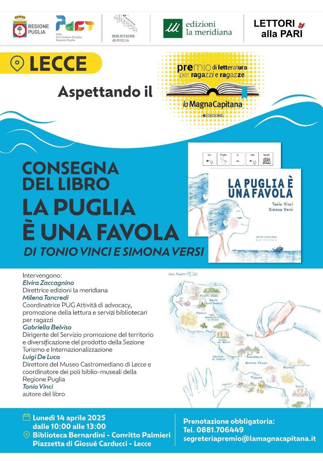- Lunedì 14 aprile, dalle 10:00 alle 13:00, presso il Teatrino del Convitto Palmieri della Biblioteca Bernardini di Lecce: Questo evento, dedicato alle scuole e alle biblioteche di Lecce, Brindisi e Taranto partecipanti al premio, offrirà un'ulteriore opportunità per scoprire il libro "La Puglia è una favola".