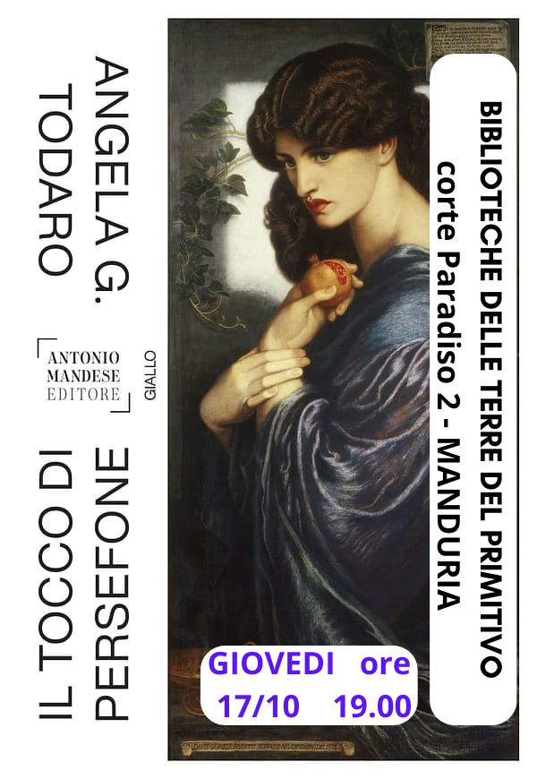 Il primo appuntamento della "Piccola Rassegna letteraria di Racconti e territori" si terrà giovedì 17 ottobre alle ore 19.00. Si partirà con un thriller storico che affonda le radici nella sorprendente Puglia Magnogreca, con una particolare attenzione all’aspetto femminile dell’indagine sociale. “Il tocco di Persefone”, di Angela Giovanna Todaro, pubblicato per i tipi di Antonio Mandese Editore, è reduce dal Salone del Libro di Torino e, nella sua specificità di genere, rende in modo unico e personale gli angoli storici della Città dei Due Mari. Dialoga con l’autrice lo scrittore Giuse Alemanno.